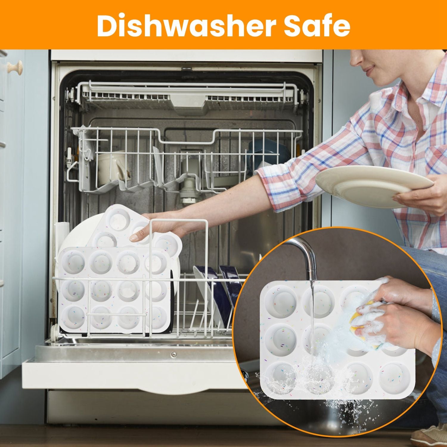 *Flexible & Nonstick*:Compared to metal pan,this reinforced silicone cupcake baking pan is a breeze to release and resistant to rust. The silicone material is also safe for direct contact with food,ensuring hygiene and health during baking and cooking processes. The polished surface makes muffins pop out easily once pressing finger from bottom.